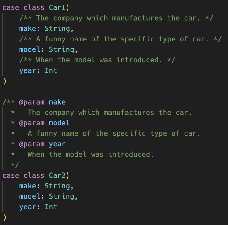 #Scala documentation for fields of case classes - inline, or part of the top-level scaladoc?