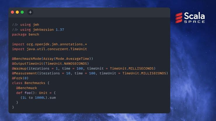 (3/7) JMH benchmarking has received some improvements as well (but is still an experimental feature as well). Benchmarks can now be controlled with dedicated using directives as well as command line options.
